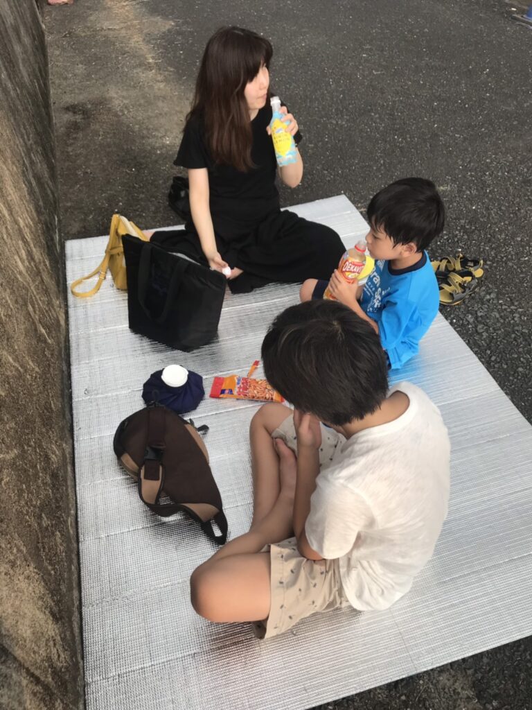 ボートレース場は早くもたくさんの車。人々が一列に並んで歩いて行くのについて行き、突然始まった夏の匂いを吸い込みながら歩く。奥さんは持ってきたシートを日除けに使うテクを駆使して、まあまあの距離を歩く。