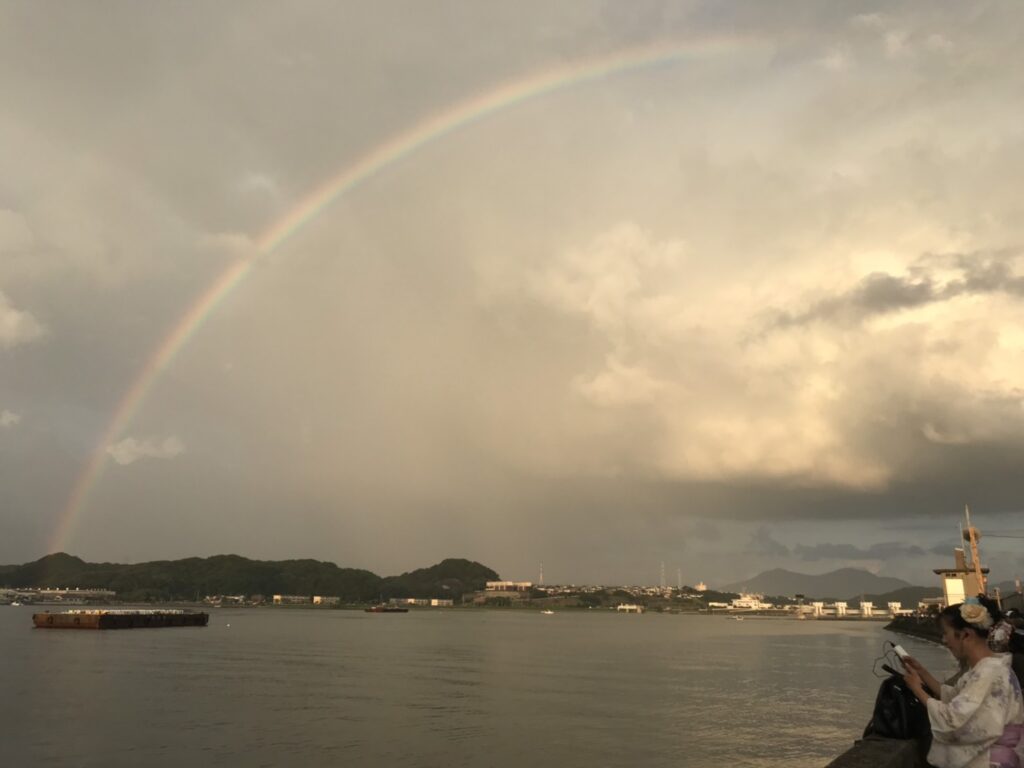 シートを敷いて時を待っていると、19時半にはシートを片付けるようアナウンスが。オールスタンディングってことなのね。軽い夕立が何回かあったけど、この暑さではむしろ心地いい。おまけに、虹も出てきた。