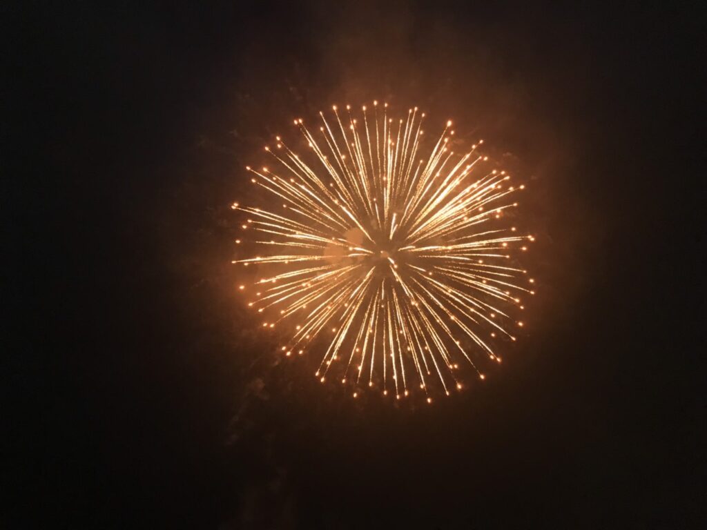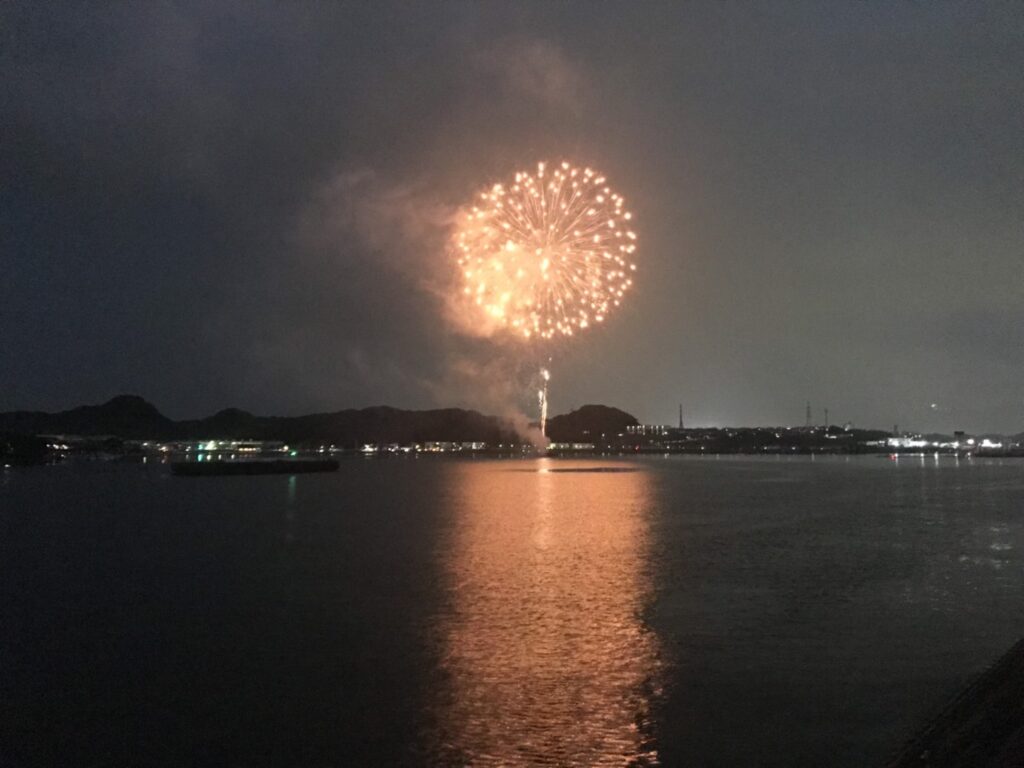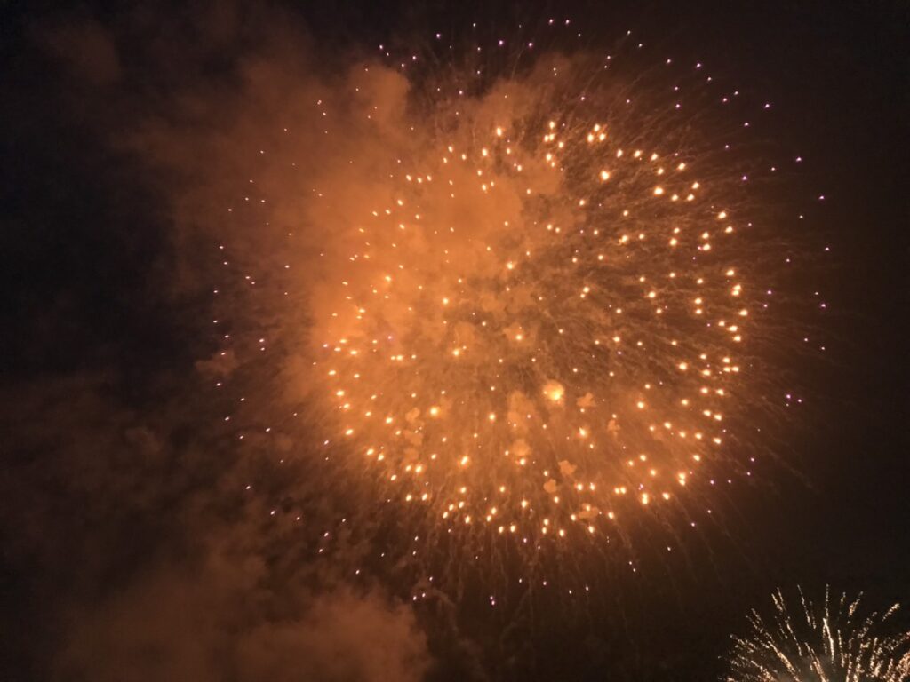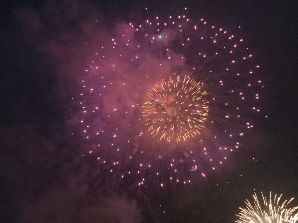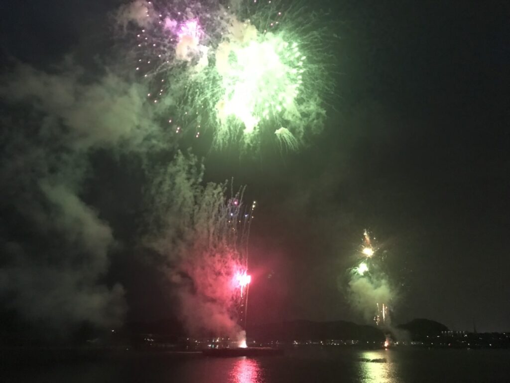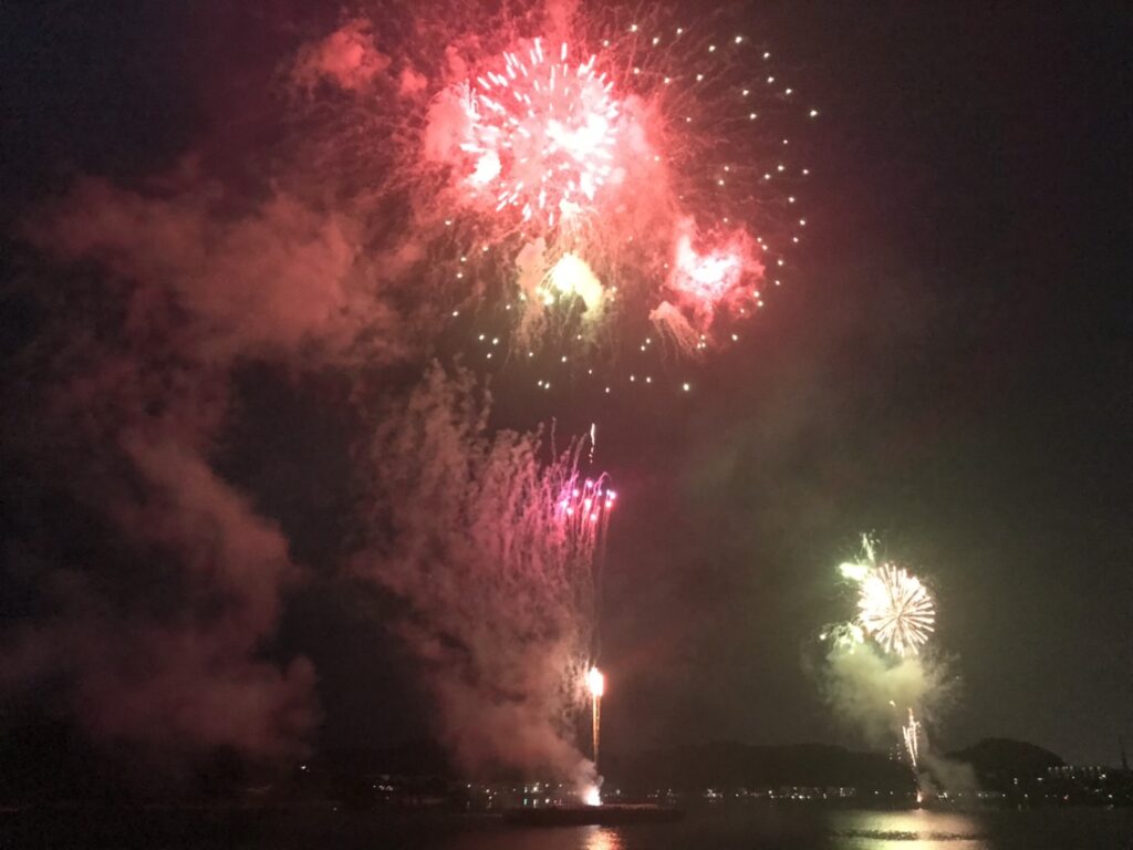 花火大会は細かいプログラムに分かれて、タイトルごとにテーマがあるみたい。違いはあまりピンとこなかったが、だんだんと打ち上げられる数が増え、大きさが増していく感じ。目の前から打ち上がる花火の臨場感と音量は、やっぱり凄い!!中には、水中から上がってくるものも。