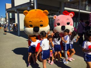 「ゆるキャラショー」で大活躍のジョー君&ピットちゃんもこの通り、子供たちと積極的に触れ合ってます。