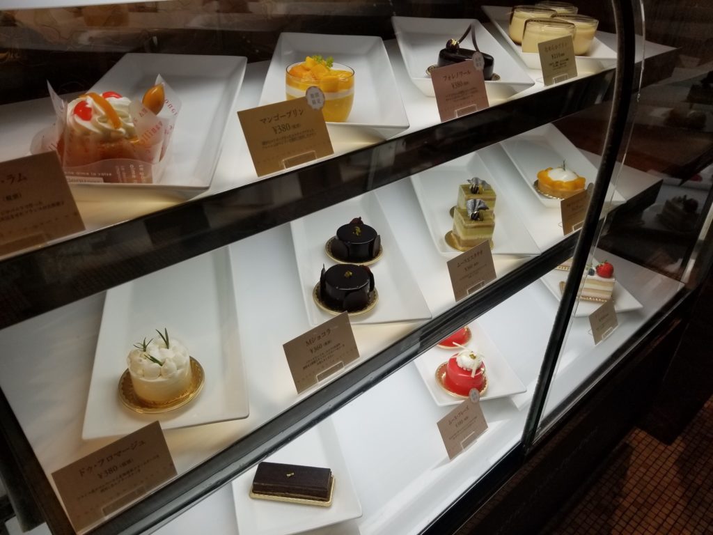 しばらく悩みながら、私たちはコチラのケーキをいただきました[マンゴープリン、Mショコラ、ドゥ・フロマージュ、プリン]。