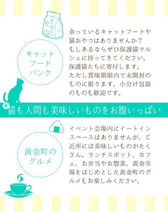 「マルシェに行くついでに猫に会う」でも良し、「猫に会うついでにお買い物」でも良し!猫と触れ合いながら、素敵な商品を見つけることができるのがこのイベントの魅力。保護猫と新たな家族になれるチャンスも!特にペットフードや雑貨に興味がある方は必見です。