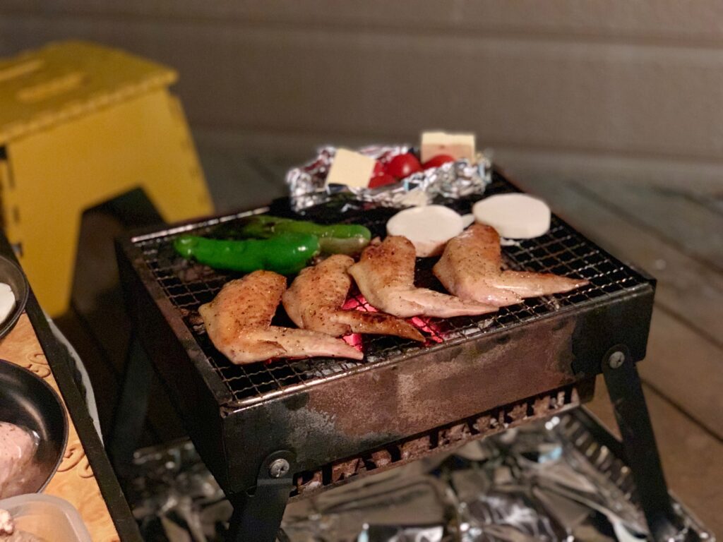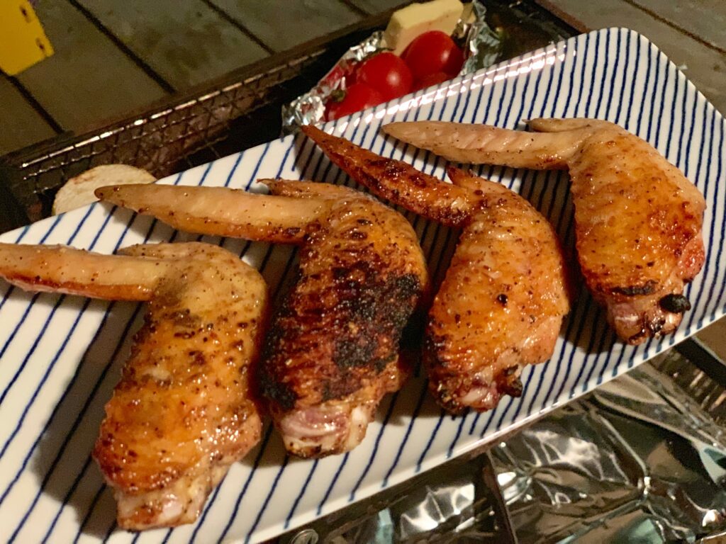 今回は完全手抜きの為、手羽先にしました。袋に手羽先を入れて黒瀬のスパイスを適当に振り入れ揉み込み下味をつけます。炭火の上で良い色になるまでじっくり焼いて出来上がりです。