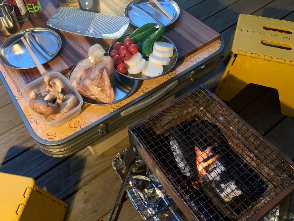ちなみに野菜は旬のものをと思い、甘長とうがらし、長いも、生椎茸、あとミニトマトにしました。長いもは皮を剥いて切るというほんのちょっとの手間がかかりますが、炭で焼くと中がほくほくとしてとても美味しいので少々の手間は仕方ありません。それ以外はそのまま 網に乗せるだけの超らくちん。