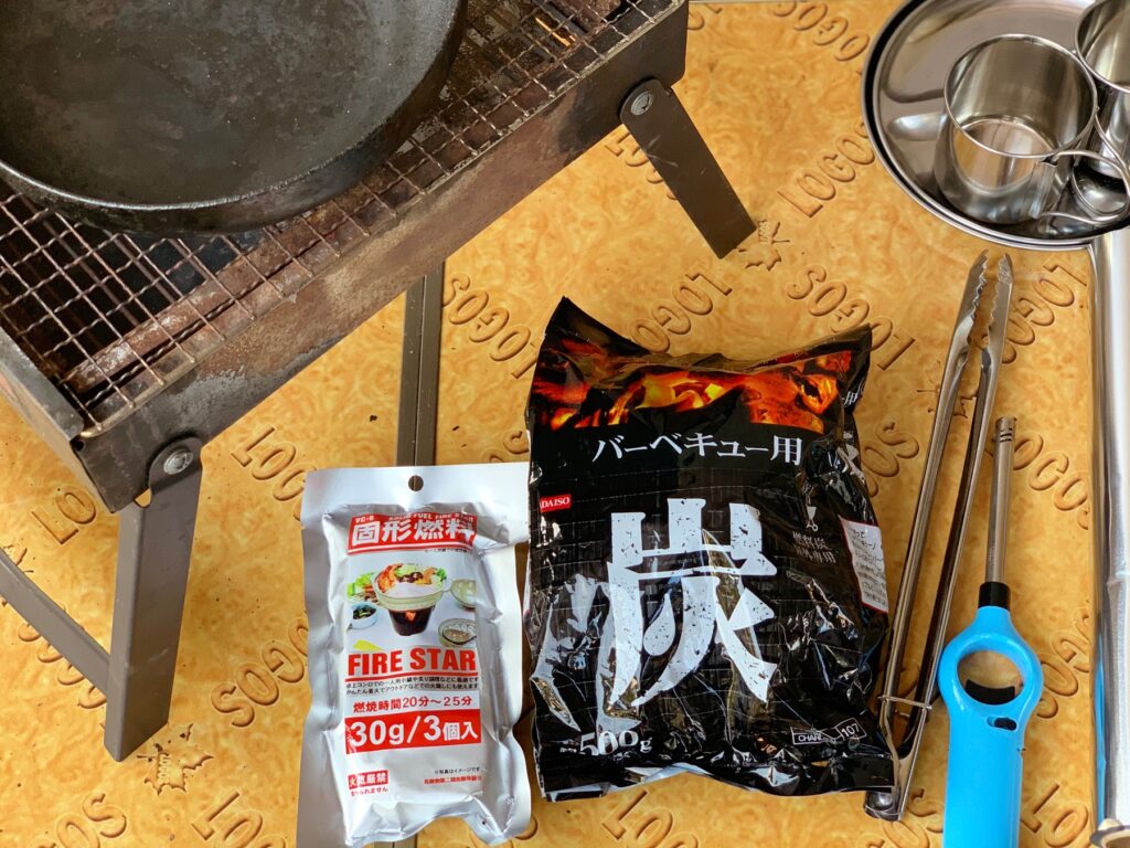 雰囲気を楽しむだけなので、私はこれで充分。コンロに固形燃料を置いて、それを囲い覆うように炭を置いて固形燃料に火をつけるだけ。火おこしにこだわりはまだ無いので、簡単すぎるし怖くないこの方法はバーベキュー経験が少ない方におすすめです。15分から20分くらい放置している間に勝手に炭にも火がつくので、その間に焼きたいものを準備します。