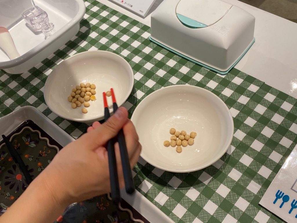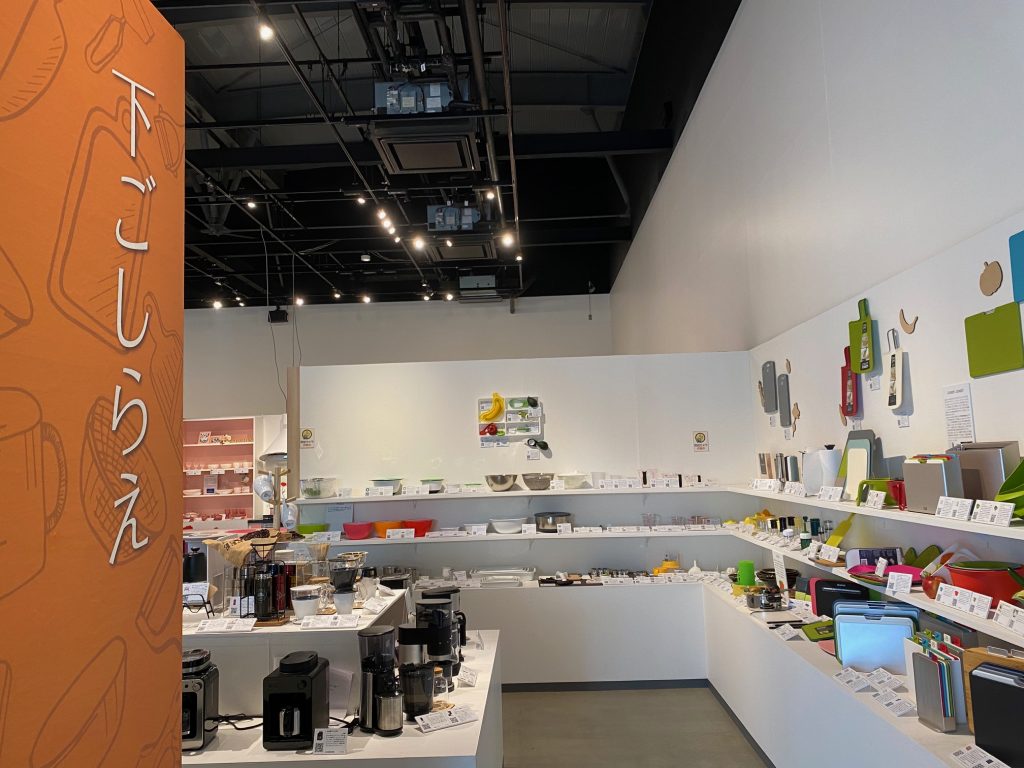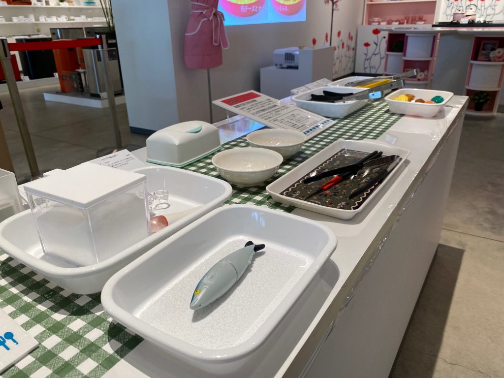 感激と遊び心満載の体験コーナーも充実。シリコン菜箸、水滴が綺麗にとれるタオル、押すだけで水気が取れる野菜水きり器などなど。