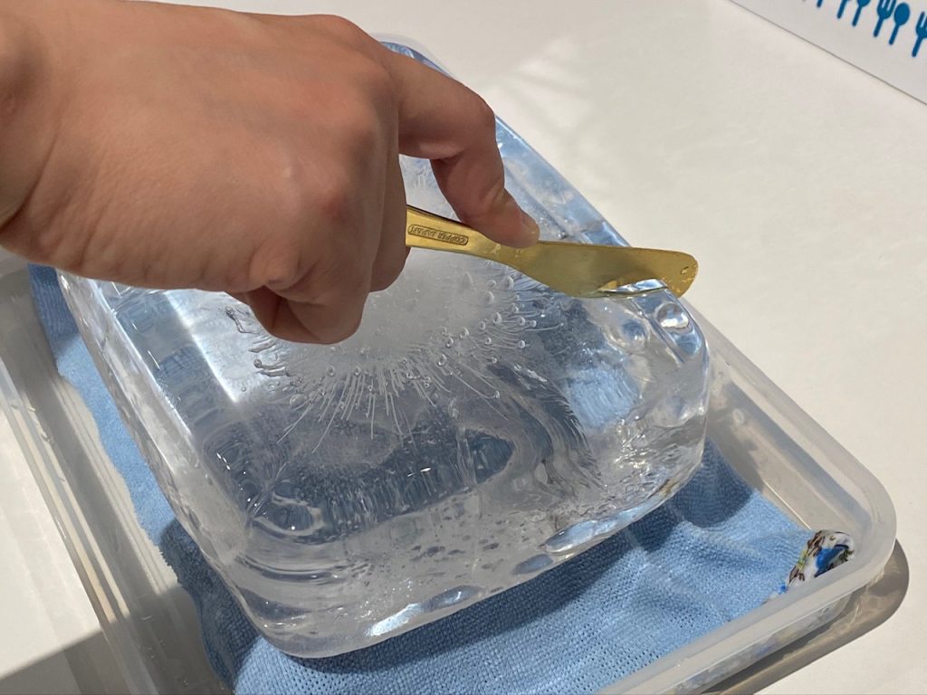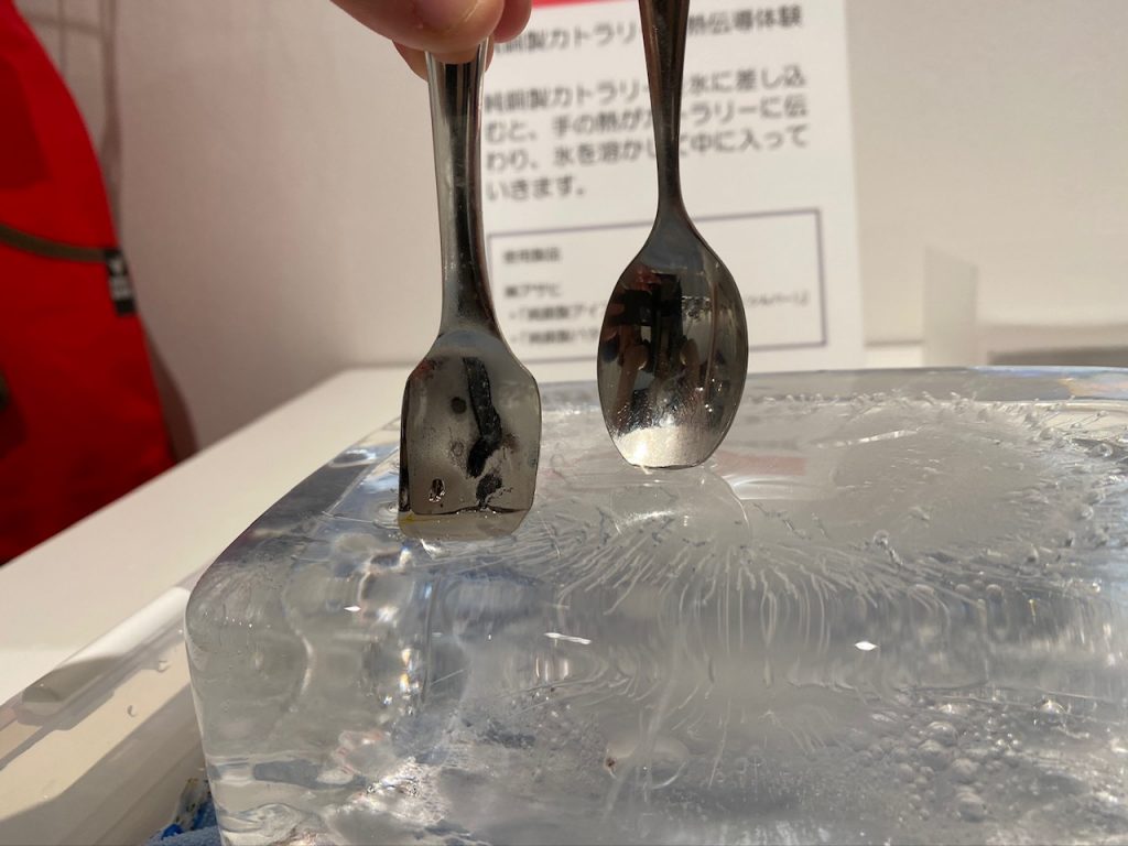 わたしが一番好きだった体験コーナーは純銅製カトラリーを使って、熱伝導で氷を切るもの!