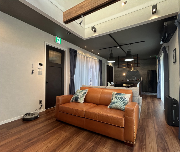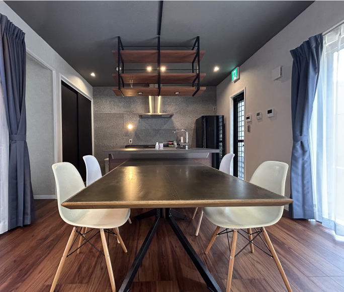 もともと住宅モデルハウスだった2階建ての一戸建て住宅を改装した宿。吹抜け天井やウッドデッキの中庭と繋がる広々としたリビングと、ウォルナット調の床やヴィンテージライクな家具で統一感のある落ち着いた雰囲気のお部屋でゆっくりとおくつろぎください。